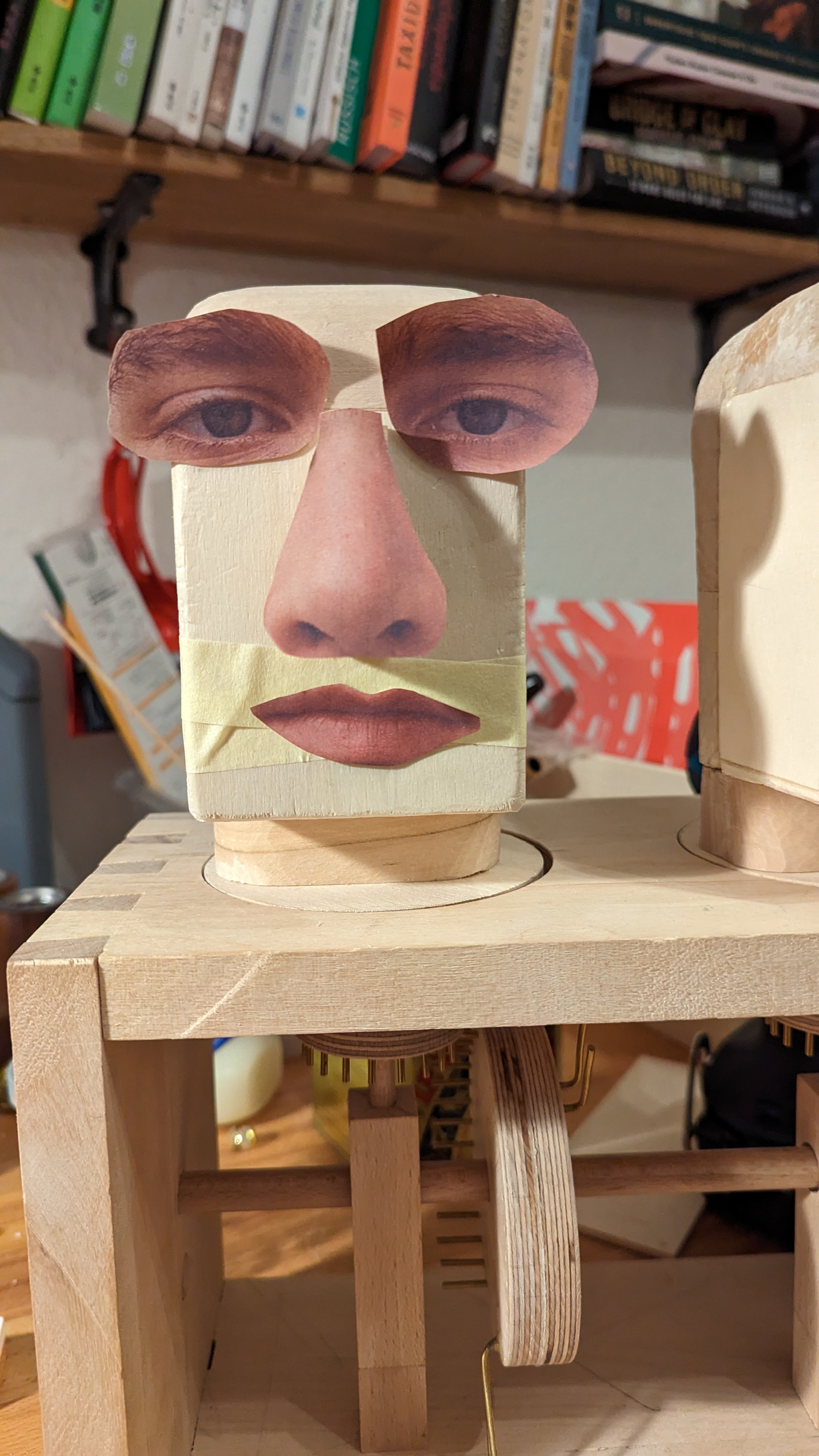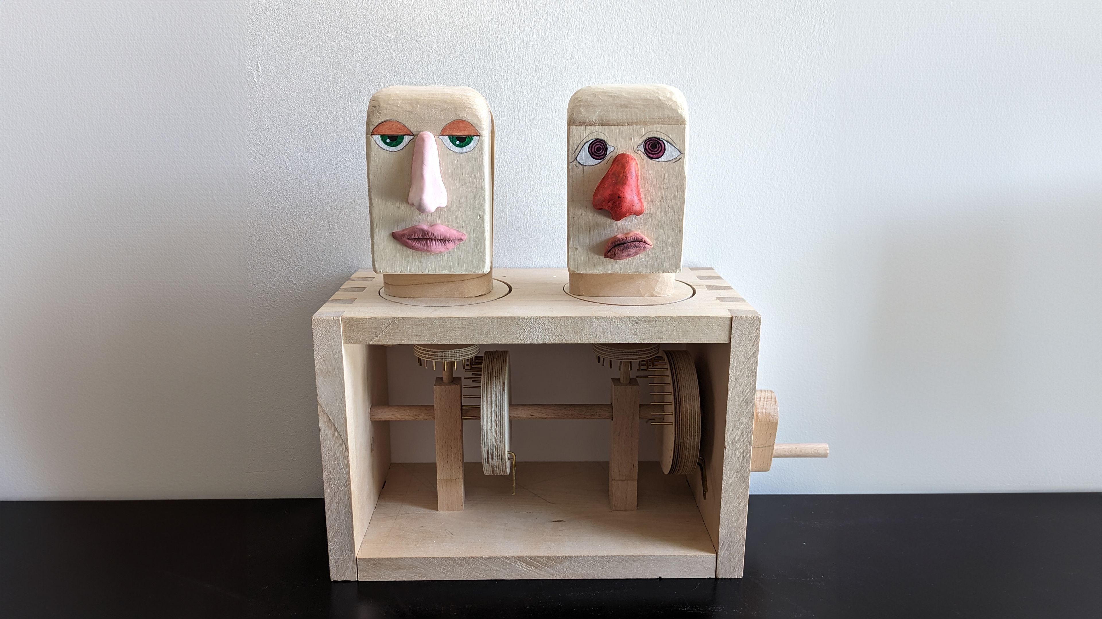 Achieving proper coupling and decoupling of the small pin wheel responsible for opening and closing the door required significant adjustments. At times, it became stuck or unintentionally turned the entire head instead of just the door. It proved to be a rather frustrating experience, and there were moments when I felt like giving up. I made sure to take ample breaks between attempts. However, when the doors finally opened and slammed shut seamlessly, it felt like fireworks were going off in my head. Adding the miniature porcelain tea set inside the heads was the icing on the cake, as I've always had a fondness for miniatures. Next came the task of carving the heads, something I had never done before. Little did I realize just how time-consuming and physically demanding it can be. After countless hours of listening to audiobooks and podcasts, I managed to achieve somewhat acceptable shapes. Finally, the last step involved giving the cupboardheads their faces. I experimented with different styles before settling on clay for the nose and mouth (no more carving!) and painting the eyes. This project marked my first venture into automata, and it's far from perfect. I made plenty of mistakes along the way, but I hope to learn from them. Despite the challenges I faced, the entire process turned out to be quite enjoyable.